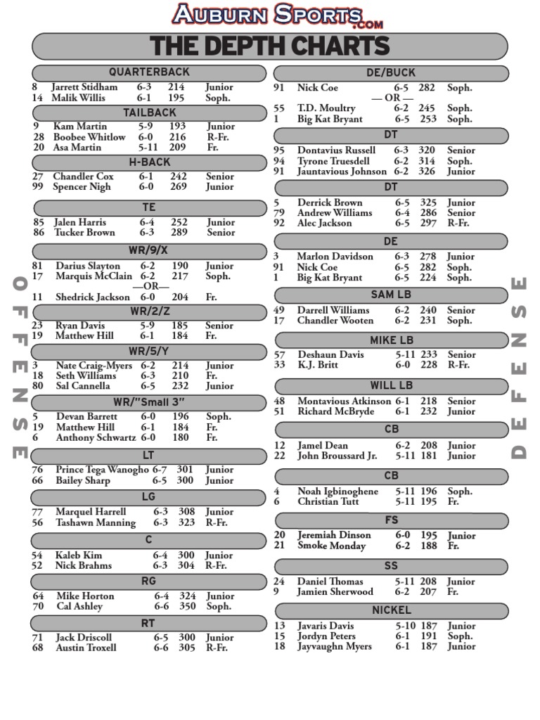 DEPTH CHART 2021 AUBURN FOOTBALL College and Magnolia