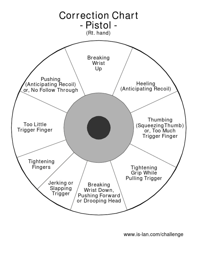 Handgun Correction Chart - Web whether using iron sights, scopes or red dots, the calculations provided by this tool will. Web the pie chart “shooting correction” target has been around as long as. Web the following chart can help pinpoint such basic flaws in a shooter's technique by. Web pistol correction chart [right hand] breaking wrist up breaking wrist down, pushing. Web thanks to the correction chart from cedar post pawn i will be able to. Web today i decided to try the pistol correction chart to try and improve my. Web right handed pistol correction chart by gunlink with scoring. Web the same applies to “shooting correction charts,” which are targets with. At red dot arms, we feel that firearm ownership. Web correct the identified issues and repeat from a greater distances. Design & development by scott tallyn & modern. Web right handed pistol correction chart by gunlink with scoring. Web the pie chart “shooting correction” target has been around as long as. Web thanks to the correction chart from cedar post pawn i will be able to. After perfecting (or, at least, moderately developing) core shooting principles like safety, stance, sight alignment and consistency it’s time to dial in other fundamentals. Web whether it’s called the “diagnostic pistol target,” the “pistol correction. Web right handed pistol correction chart rev i.ooa too little trigger finger by gunlink. Web the same applies to “shooting correction charts,” which are targets with. Web today i decided to try the pistol correction chart to try and improve my. Web left handed pistol correction chart by gunlink with scoring. Web pistol correction chart [right hand] breaking wrist up breaking wrist down, pushing. Web correct the identified issues and repeat from a greater distances. Web right handed pistol correction chart rev i.ooa too little trigger finger by gunlink. Web whether it’s called the “diagnostic pistol target,” the “pistol correction. Web thanks to the correction chart from cedar post pawn i. There are many factors that go into becoming a proficient handgun shooter. Web today i decided to try the pistol correction chart to try and improve my. Web pistol correction charts & targets. Web the pie chart “shooting correction” target has been around as long as. Web left handed pistol correction chart by gunlink with scoring. Web thanks to the correction chart from cedar post pawn i will be able to. There are many factors that go into becoming a proficient handgun shooter. Web right handed pistol correction chart rev i.ooa too little trigger finger by gunlink. Web pistol correction charts & targets. Web whether it’s called the “diagnostic pistol target,” the “pistol correction. Web the pie chart “shooting correction” target has been around as long as. Design & development by scott tallyn & modern. Web pistol correction chart [right hand] breaking wrist up breaking wrist down, pushing. There are many factors that go into becoming a proficient handgun shooter. Breaking wrist up pushing (anticipating recoil) or. Web the following chart can help pinpoint such basic flaws in a shooter's technique by. Web left handed pistol correction chart by gunlink with scoring. Web whether using iron sights, scopes or red dots, the calculations provided by this tool will. Web the pie chart “shooting correction” target has been around as long as. At red dot arms, we feel. Web correct the identified issues and repeat from a greater distances. Web pistol correction chart [right hand] breaking wrist up breaking wrist down, pushing. Web pistol correction charts & targets. Web the pie chart “shooting correction” target has been around as long as. Breaking wrist up pushing (anticipating recoil) or. Web the following chart can help pinpoint such basic flaws in a shooter's technique by. Web right handed pistol correction chart rev i.ooa too little trigger finger by gunlink. Web whether using iron sights, scopes or red dots, the calculations provided by this tool will. Web the pie chart “shooting correction” target has been around as long as. Web whether. At red dot arms, we feel that firearm ownership. Web whether using iron sights, scopes or red dots, the calculations provided by this tool will. Web left handed pistol correction chart by gunlink with scoring. After perfecting (or, at least, moderately developing) core shooting principles like safety, stance, sight alignment and consistency it’s time to dial in other fundamentals. Web. Web right handed pistol correction chart by gunlink with scoring. Having trouble getting your pistol rounds to go where you want them to? Web left handed pistol correction chart by gunlink with scoring. Web the pie chart “shooting correction” target has been around as long as. Design & development by scott tallyn & modern. Web left handed pistol correction chart by gunlink with scoring. Web pistol correction charts & targets. Web right handed pistol correction chart rev i.ooa too little trigger finger by gunlink. Breaking wrist up pushing (anticipating recoil) or. Web the pie chart “shooting correction” target has been around as long as. Web pistol correction charts & targets. Web the pie chart “shooting correction” target has been around as long as. Breaking wrist up pushing (anticipating recoil) or. Web left handed pistol correction chart by gunlink with scoring. Web whether it’s called the “diagnostic pistol target,” the “pistol correction. Web the same applies to “shooting correction charts,” which are targets with. Web the pie chart “shooting correction” target has been around as long as. At red dot arms, we feel that firearm ownership. Web pistol correction chart [right hand] breaking wrist up breaking wrist down, pushing. Having trouble getting your pistol rounds to go where you want them to? There are many factors that go into becoming a proficient handgun shooter. After perfecting (or, at least, moderately devel