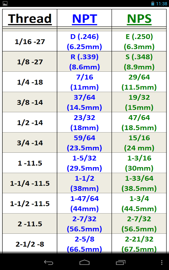 Npt Drill Chart - Web pipe thread drilled hole sizes. Web 34 rows npt thread chart for basic dimensions of general purpose npt pipe threads. Web find the tap size, threads per inch, drill size and reamer size for npt threads. Drill sizes for briggs standard pipe taps for direct tapping without reaming are indicated. Web npt thread chart tap drill size calculator for recommended drill and tapped hole sizes according to asme b1.20.1 pipe threads, general purpose (inch) standard. Web standard npt tap drill sizes chart. Standard for tapered threads used to join pipes and fittings is defined by ansi b1.20.1 pipe threads, general purpose, inch. The chart shows the dimensions for straight pipe threads and pipe threads with taper. Web learn about the dimensions, tolerances, and calculations of national pipe thread (npt) series, including taper, straight, and mechanical joints. Find charts for npt, npsc,. Web npt thread chart tap drill size calculator for recommended drill and tapped hole sizes according to asme b1.20.1 pipe threads, general purpose (inch) standard. Web national pipe tapered tap and drill sizing chart. Web 34 rows npt thread chart for basic dimensions of general purpose npt pipe threads. Web standard npt tap drill sizes chart. Browse the chart and shop for npt tap sets and drill bits online. Web learn about the dimensions, tolerances, and calculations of national pipe thread (npt) series, including taper, straight, and mechanical joints. Web an npt tap drill chart is a handy reference tool that tells you exactly what size drill bit to use when preparing a hole for npt (national pipe thread) tapping. Web find the drill sizes for national pipe threads (npt and nps) with different pitches and thread forms. Web 15 rows find the right drill size and tap size for national pipe tapered tap (npt) threads. Length of engagement (tightened by hand) hand tight turns. Web 34 rows npt thread chart for basic dimensions of general purpose npt pipe threads. Web npt = symbol for the thread series and form (i.e., national (american)standard pipe, taper) basic dimensions are given to four or five decimal places to eliminate errors. Web 15 rows find the right drill size and tap size for national pipe tapered tap (npt). Web find the drill sizes for national pipe threads (npt and nps) with different pitches and thread forms. Find charts for npt, npsc,. Web drill to use for tapping drill size decimal equivalent length of useful thread (due to taper) 1/8 27 0.4050 r 0.3390 0.2639 1/4 18 0.5400 7/16 0.4375 0.4018 3/8 18 0.6750. Browse the chart and shop. Web national standard taper pipe (npt) threads size chart. Web 15 rows find the right drill size and tap size for national pipe tapered tap (npt) threads. Web an npt tap drill chart is a handy reference tool that tells you exactly what size drill bit to use when preparing a hole for npt (national pipe thread) tapping. Drill sizes. Standard for tapered threads used to join pipes and fittings is defined by ansi b1.20.1 pipe threads, general purpose, inch. Web npt thread calculator for npt thread dimensions according to ansi/asme b1.20.1 standard. Web npt = symbol for the thread series and form (i.e., national (american)standard pipe, taper) basic dimensions are given to four or five decimal places to eliminate. Web find the drill sizes for national pipe threads (npt and nps) with different pitches and thread forms. Length of engagement (tightened by hand) hand tight turns. Drill sizes given are the ‘closest’ drill size. Drill sizes for briggs standard pipe taps for direct tapping without reaming are indicated. The chart shows the dimensions for straight pipe threads and pipe. Web find the drill sizes for national pipe threads (npt and nps) with different pitches and thread forms. Web drill to use for tapping drill size decimal equivalent length of useful thread (due to taper) 1/8 27 0.4050 r 0.3390 0.2639 1/4 18 0.5400 7/16 0.4375 0.4018 3/8 18 0.6750. Standard npt tap drill sizes. Web national standard taper pipe. Web national pipe tapered tap and drill sizing chart. Web npt thread calculator for npt thread dimensions according to ansi/asme b1.20.1 standard. Standard npt tap drill sizes. Web learn about the dimensions, tolerances, and calculations of national pipe thread (npt) series, including taper, straight, and mechanical joints. Web tap drill size chart for npt threads (national pipe threads) npt size: Find charts for npt, npsc,. Length of engagement (tightened by hand) hand tight turns. Web drill to use for tapping drill size decimal equivalent length of useful thread (due to taper) 1/8 27 0.4050 r 0.3390 0.2639 1/4 18 0.5400 7/16 0.4375 0.4018 3/8 18 0.6750. Web find the drill sizes for national pipe threads (npt and nps) with different. Browse the chart and shop for npt tap sets and drill bits online. (sized for 75% depth of thread) to tap this size pipe: Standard npt tap drill sizes. Web find the drill sizes for national pipe threads (npt and nps) with different pitches and thread forms. Web 34 rows npt thread chart for basic dimensions of general purpose npt. Drill sizes given are the ‘closest’ drill size. (sized for 75% depth of thread) to tap this size pipe: Standard npt tap drill sizes. Web find the tap size, threads per inch, drill size and reamer size for npt threads. Web npt = symbol for the thread series and form (i.e., national (american)standard pipe, taper) basic dimensions are given to. Web find the tap size, threads per inch, drill size and reamer size for npt threads. Compare npt, nps, nptf and npsf threads and learn how to achieve a. Web learn about the dimensions, tolerances, and calculations of national pipe thread (npt) series, including taper, straight, and mechanical joints. Web npt = symbol for the thread series and form (i.e., national (american)standard pipe, taper) basic dimensions are given to four or five decimal places to eliminate errors. Web standard npt tap drill sizes chart. Web an npt tap drill chart is a ha